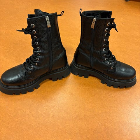Skoene er kun prøvd inne i butikk, merkelappen henger fortsatt på.