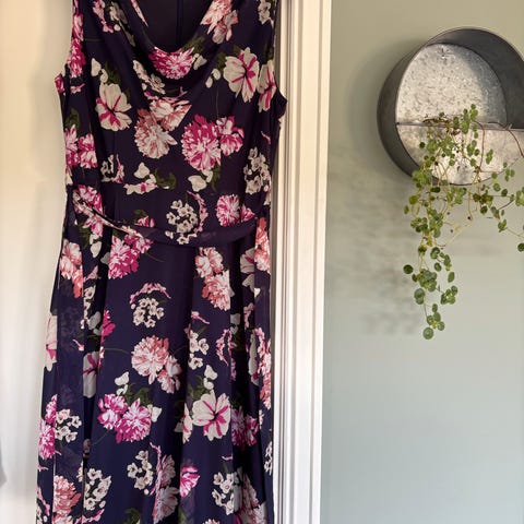 Søt, kort, blomstrete sommerkjole med strikk i livet og detaljer i rygg. Str. 44.