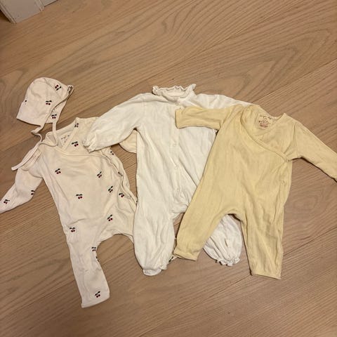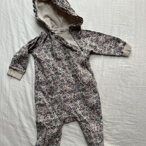 Heldrakt i bomull fra Konges Sløjd. Mønster med små blå blomster. I fin stand. Ingen flekker eller skader. Kan lukkes på fot og arm. Hette med ører. Str 64-74 (6-9 mnd).