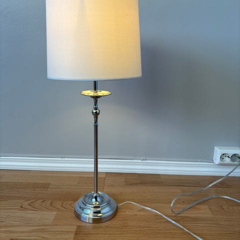 To bordlamper med hvite lampeskjermer selges fortrinnsvis sammen til kr 500.