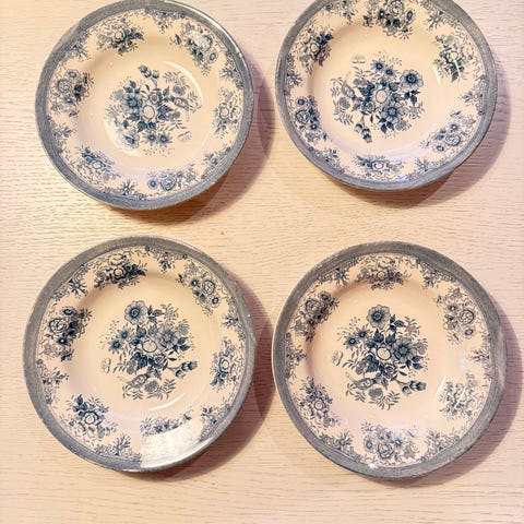 Selger to tallerkner med Egersund rococo stempel og to med Egersund norsk flint stempel . De med rococo stempel har mørkes farge på tallerken .
