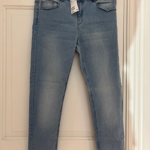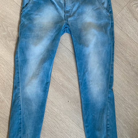 Str 40. Flott olabukse med effekter laget slik at den ser slitt ut…. med påsydde hull-lapper og «slitt» bak på lommene. En liten tanke lysere enn hva bildene viser.