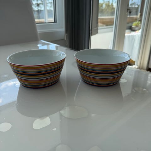 Ittala skåler, 2 stk, i flerfarget stripet mønster. Pris for begge, frakt kommer i tillegg.