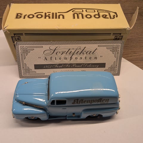 Selger min altfor store samling av amerikanske Brooklin modellbiler. Disse bilene er håndlagde modellbiler i "white metal". Modellene er ettertraktede samle objekter i Europa og ble utgitt i et begrenset opplag, sjelden flere enn 1000-2000 stk. Alle modellene kommer med eske. Skala 1:43.