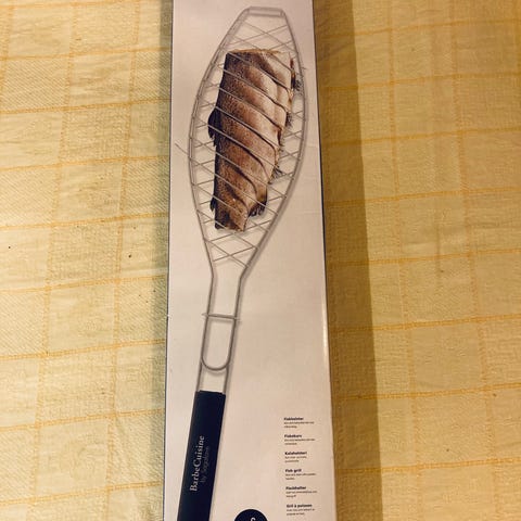 Selger en grillspade med rist til fisk - kan også brukes til annen mat. Legges rundt maten og klemmer igjen innholdet.