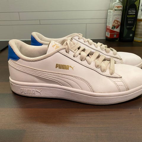 Hvite puma sneakers i str 39. Noen flekker av bruk av hvite sko, men er veldig lite brukt. Kan muligens vaskes bort.