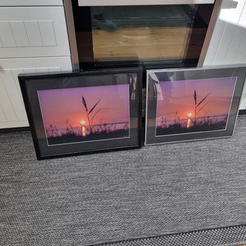 To bilder. Bildet er montert på en papplate, 2-3 mm tykk. Enkel ramme fra Ikea. Selve bildet har størrelse 24x18 cm, rammen har mål 32x42 cm. De kan evt sendes uten ramme.
