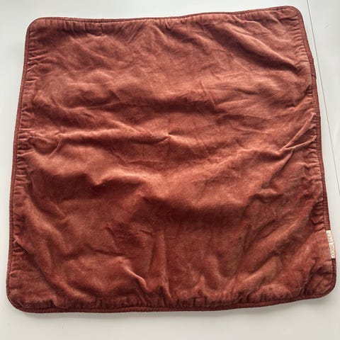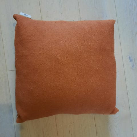 Et eldre putetrekk i 40x40. Gylden brunlig farge. Materiale er tykt. Litt usikker på eksakt stoff.