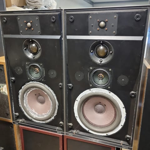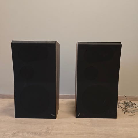 Hele og pene høyttalere som ramlet ned fra et skap. Skade i et hjørne, (Se bilde) og et par av festepinnene til frontene er knekt . Nye membran oppheng på bass elementene. Må hentes.
