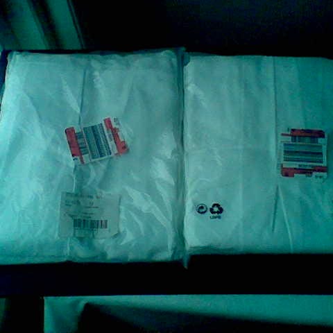 Trekkene passer de fleste spisestoler. Sydde legg bak. Sete: B 44 cm i forkant. D 44 cm. Kappe 40 cm. Rygg: B 43 cm. H 57 cm. Kappen er 45 cm. Pris pr. pakke med to trekk kr. 798 hos Ellos - selges for kr. 498 pr. pakke. Ên pakke kun åpnet for å vise trekket på egen stol. Har nå to pakker igjen.