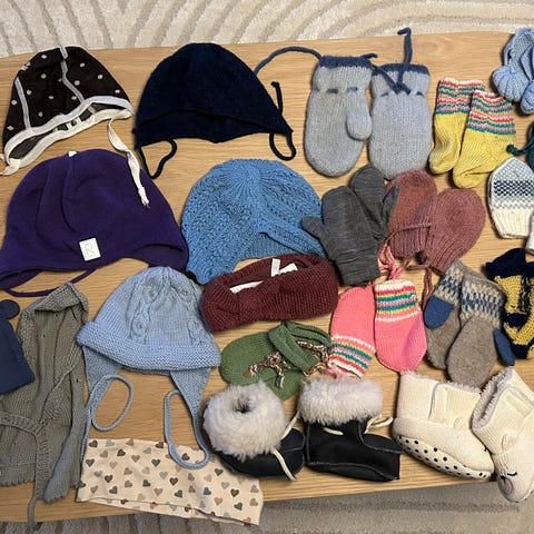 1 kivat balaclava i ull str 1, men har krympet litt i vask, så vil si den tilsvarer str 0 (0-1år)