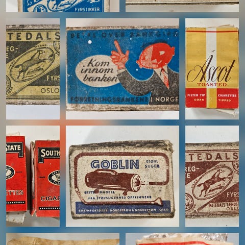 Selger en samling med 12 innrammede IDDISER, pent innrammet i hvit ramme med glass.