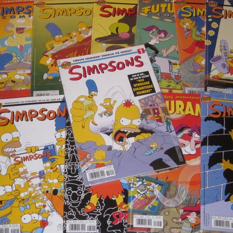 Et knippe engelskspråklige Simpsons tegneserier. 4 tykke album og 5 blader