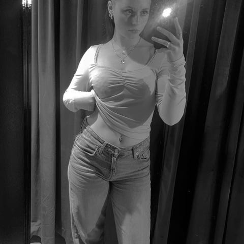 Klipt selv ved halsen slik at man kan bruke den off shoulder