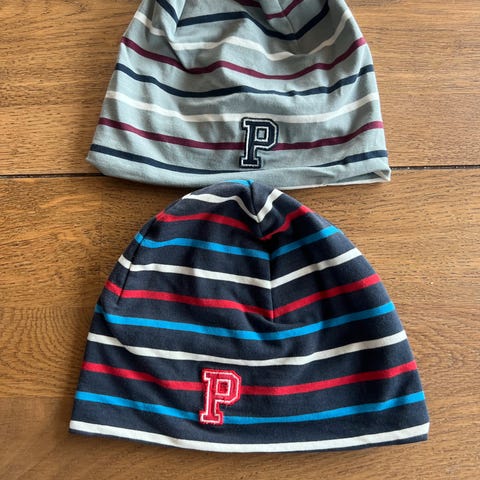 Selger to pent brukte luer fra Polarn. Str 9 mnd -2 år. En i bomull og en med fleecefor. Selges salmet for 250 kr eller 150 kr per