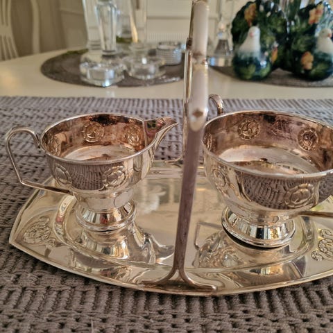 Selges pent brukt sukker og fløte sett i porselen fra Wictoria, Kina. Skål 14 x 6,5 cm. Mugge 12 x 7 cm. Sender gjerne men kjøper må betale for frakt