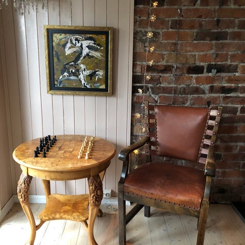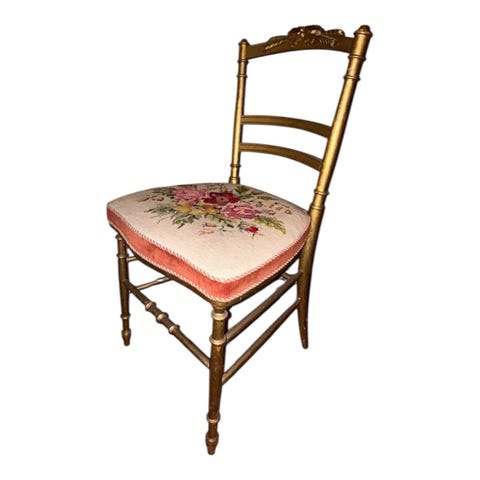 Selger en eldre stol i solid og godt tre. Den har kunn stått til pynt så er veldig fin og god å sitte i, men ser ut til å blitt litt solbleknet i stoffet.