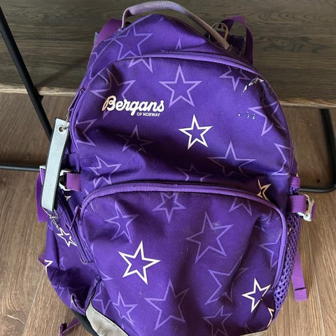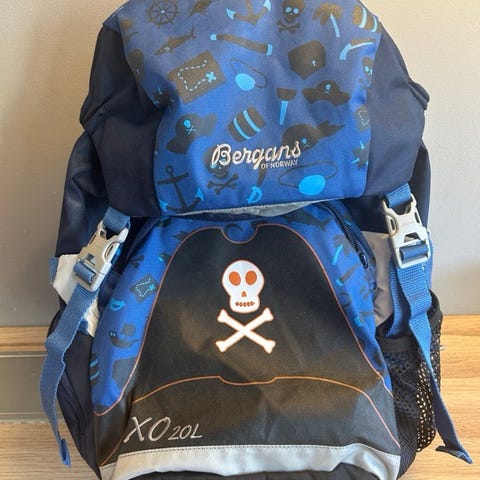 Grå med skinndetaljer og tilhørende regntrekk. God støtte i rygg med mulighet for å justere etter barnets lengde - kan trenge en vask.
