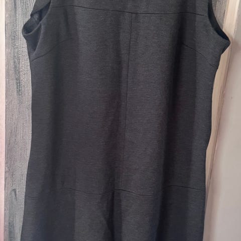 Pen selskapskjole fra franske Camaïeu, brukt ca 4-5 ganger. Dyp grå, med fløyelsbånd under bysten med dekorasjonsbrosje. Legg nede i skjørtet. Ingen glidelås i siden, og i forhold til norske mål vil jeg si det er en liten medium.