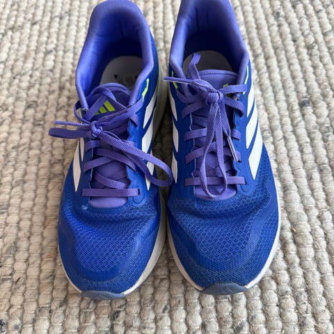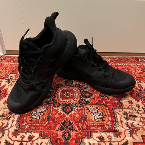 Adidas joggesko i strl 38 2/3, lite brukt da de var for store for meg. Usikker på hva modellen heter, men det står Primeblue inne i sålen og Continental på yttersålen. Tror jeg kjøpte dem for ca 2 år siden. Svarte, nyvaskede lisser hører til.