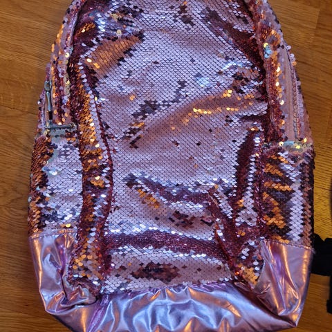 Liten glittersekk fra Lindex, ca 22 cm. To lommer og stramming i selene. Pent brukt.