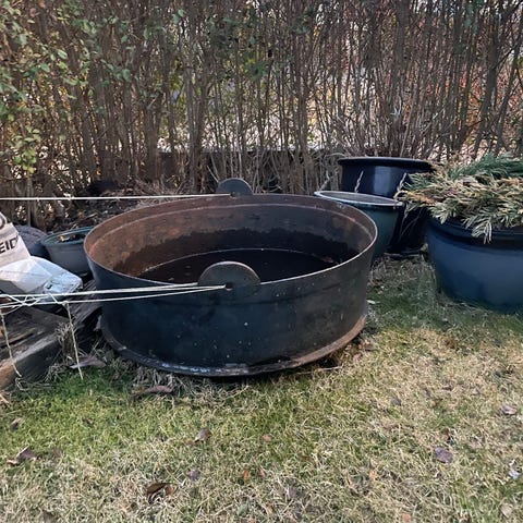 Stor solid bålpanne. Diameter ca 1060. Høyde ca 640
