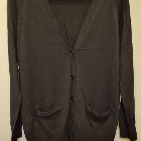 Filippa K knitted jacket, kort modell, str. S (mer som medium) sort, 74% bomull / 22% nylon / 2% elastan, pent brukt
