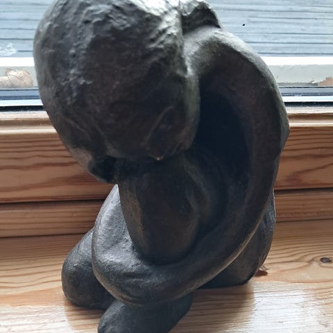 Feminin figur av dame med gode former. Ca 17 cm høy- og på det bredeste. I følge min vekt veier den 2,4 kg. Så damen står støtt! Kjøpt på Eske, selges til halv pris.