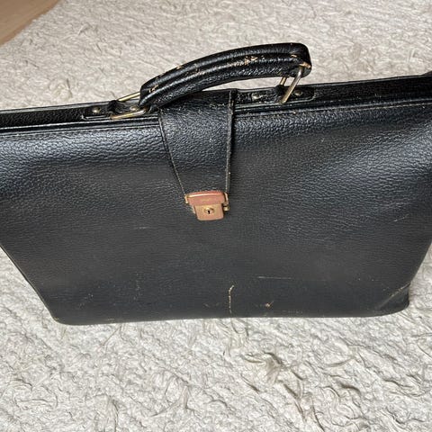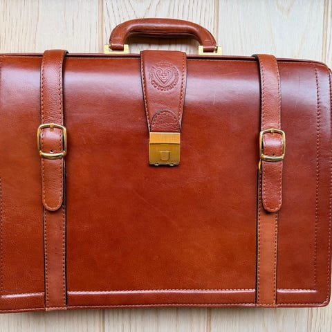 Kvalitets-stresskoffert, laget av ekte skinn. Det er noen små riper i hjørnene som enkelt kan fikses med lærmaling. Ellers ser den flott ut. Den har en kombinasjonslås