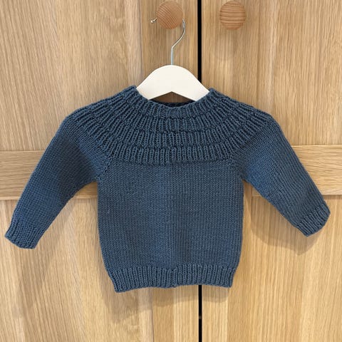 Superfin hjemmestrikket genser, strikket med dobbel ulltråd. Er opprinnelig en small damegenser, men er blitt litt «tovet» i vask. Passer derfor nå til et stort barn (vil tro 12-14 år).