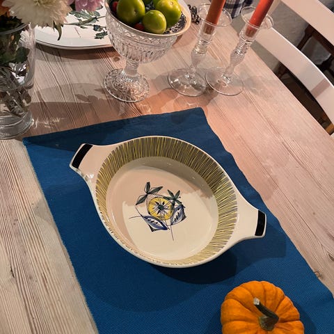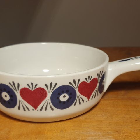 En ildfast skål av type Verdura fra Rørstrand selges. Det er noen små prikker/flekker på siden av skålen/fatet, se bilde.