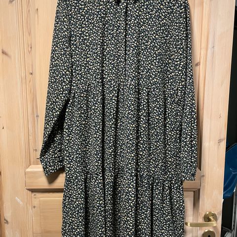 Pen kjole i lett polyester. Krage,knapper i front,kappe nede. Romslig.