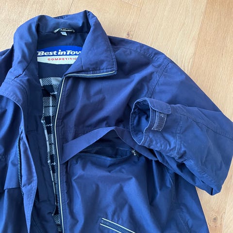 Super fint og ikke synlig brukt jakke med glidelås på fronten, glidelåstlommer høyde 78 cm.