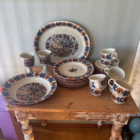 Nydelig gresk keramikk teservise importert fra Corfu Pottery 💙 Det er håndlagd og ingen av delene er derfor helt like. Består av to kaffekopper med tilhørende skål, syv tekopper, åtte asjetter, to små skåler & to litt større skåler.