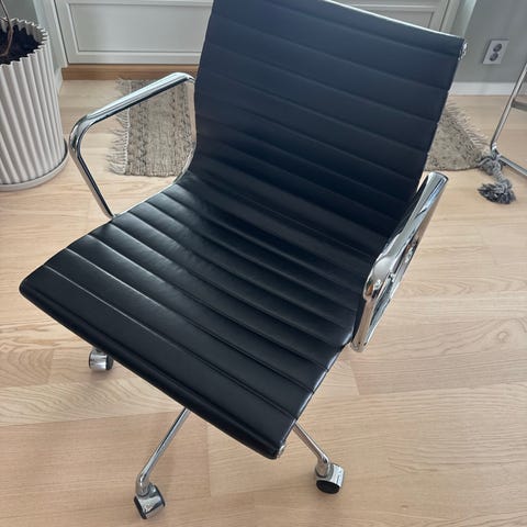 Flott designstol som fremstår som ny og ubrukt. Sittehøyde reguleres mellom 41 og 50 cm. Ryggstøtte er 47, Setedybde 47 cm og setebredde 45 cm. Antatt skinn og aluramme. Stolen har bare vært til pynt og har ikke vært i bruk.