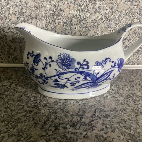 Nydelig sausnebb i blått og hvitt med pent blåklokke mønster.