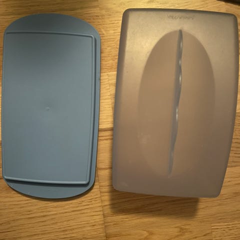 Liten Tupperware osteklokke. 17 cm. bred 11 cm. dyp, og 7 cm. høy..
