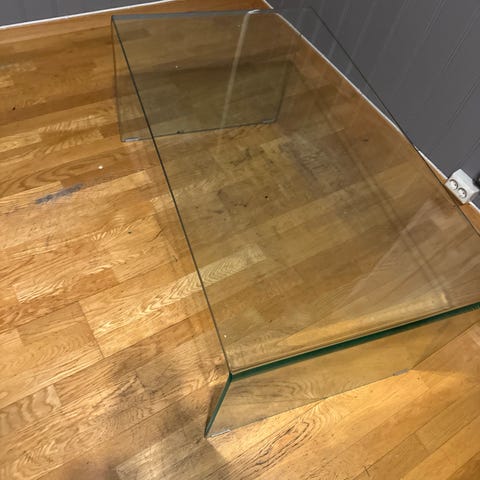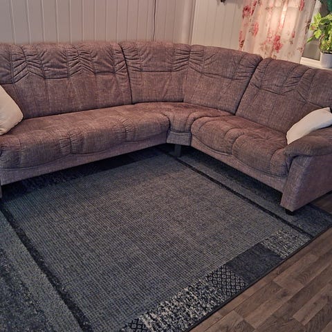 Sofabord , trekanta, passer fint til hjørnesofa. 90×90 cm , høyde 57cm . Mørk brun beisa bein og tapetsert og lakka bordplate. Solid trebord , stødig. Hentes på Kirkenær