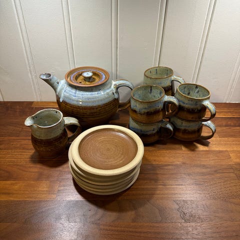 Jeg selger en flott brungrønn bolle i keramikk.. Den er ca 12,7 cm høy og har en diameter på 21 cm.