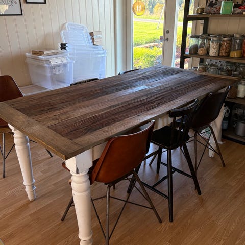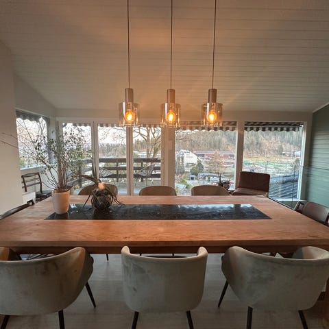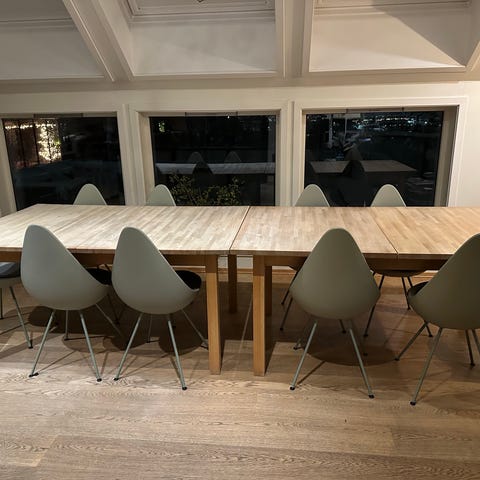 Overflatebehandlet med tre strøk matt lakk. Dette gir en naturlig overflate, samtidig som det beskytter mot rødvinsflekker etc.