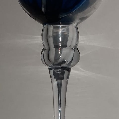 Lysestaken er 21 cm høy. Glasskuppelen er nydelig dekorert i blått og gull.