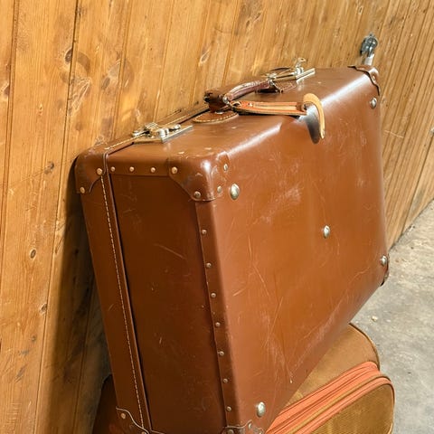 Gammel koffert i finér. Generelt sliten. Dens reisedager er nok over, men gir en fin touch til et rustikt interiør hos deg som liker gamle ting. Cirkamål 52x33x11cm.