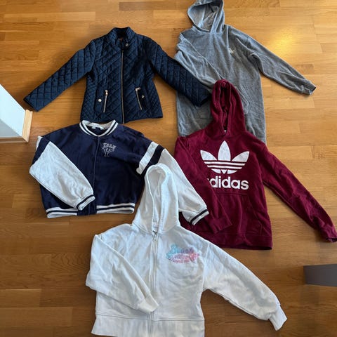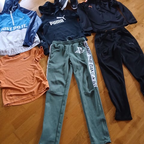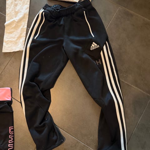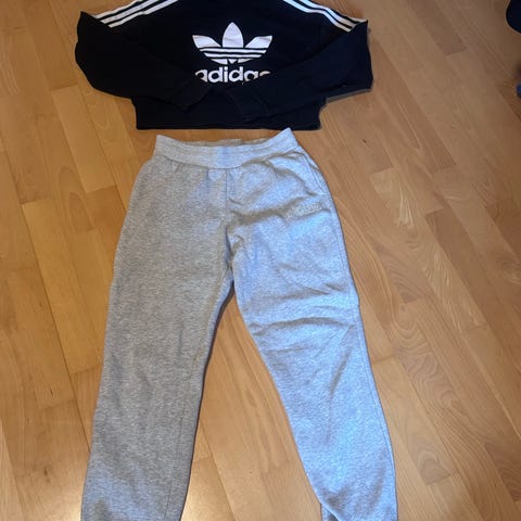 Pent brukt Adidas hettegenser i bomull med lommer. Pent brukt Adidas joggebukse med 2 lommer i siden, og en baklomme. Nike trenings bukse med snøring og strikk i livet, og 2 lommer foran. Veldig pent brukt Wow denim skjørt, Svart bomulls topp. Pakke kr 250