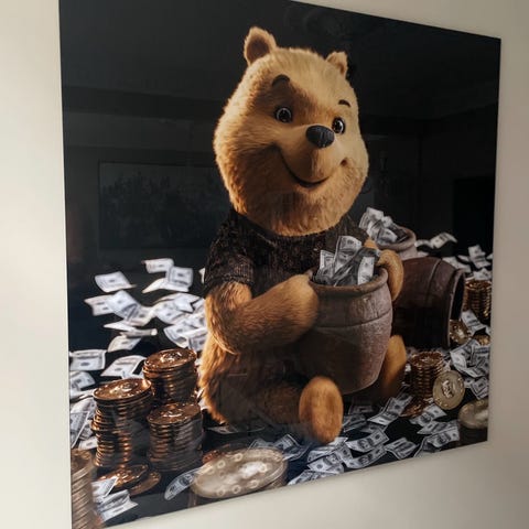 Dette er et unikt kunstverk på 60 cm bredt og 80 cm høyt, som er laget av meg. Bildet kombinerer akrylmaling med en kreativ bruk av avistrykk for å skape en dynamisk og tankevekkende bakgrunn. Maleriet sentrerer seg rundt en ikonisk avbildning av Onkel Skrue, som er kjent for sin tilknytning til rikdom og penger. Bakgrunnen er laget med utklipp fra aviser, fylt med nyhetsoverskrifter og bilder som skaper en stemningsfull og urban følelse, med klare referanser til finansverdenen. Dette kunstverket er laget med stor omsorg og detaljer, og er resultatet av mange timers arbeid.