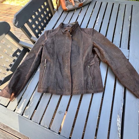 Brun skinnjakke med for , belte og lommer, liten i str. Kan brukes med og uten belte