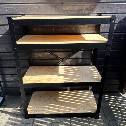 Hylle svartstål med hyller i eikefarget melamin