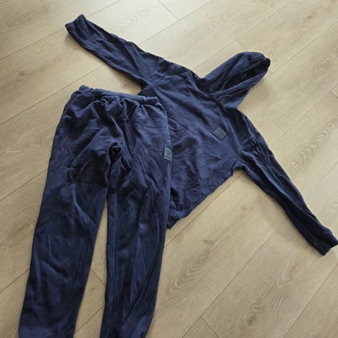 Sett med bukse og hettejakke i str 140. Godt brukt.