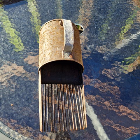 Gammel bærplukker. Blågrønn stål - blikk. Støpt lakkering. Diameter beholder 10,5 cm - bredde inkl håndtak 13,5 cm, høyde 25 cm