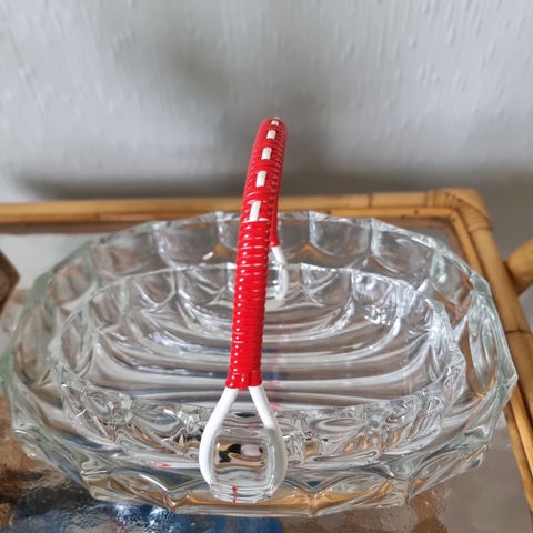 Teskjeer, konfektskål, dekorasjon, julerød.