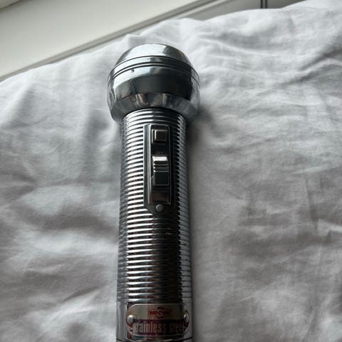 Bruker 3x LR20 (1,5V) batterier og Phillips PR3 pære (kragepære), dette medfølger ikke med mindre annet avtales spesifikt.